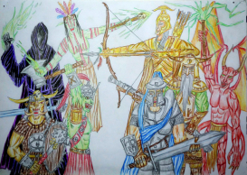 Я рисовал в той же художке битву Персея с Медузой Горгоной и работу даже выставляли, но одна из хитовых это рыцарь на верблюде, которого время от времени достают из архивов и выставляю в "Синем Коте"