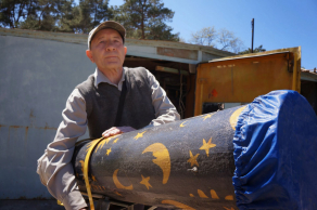 Иван Васильевич не очень то и рад был нас видеть - нас вместе с нашим интересом и фотоаппаратами. Но жена его – добродушная женщина уже пригласила нас на чай, открыла дверь и вот мы уже на пороге их квартиры, а она и добавляет, что еще за такое добродушнее выговор от мужа получит. Мы улыбнулись, конечно, приготовили фотоаппараты и диктофон. Она повела нас по всем комнатам. В детской стоял новогодний посох. «Да, это все Иван сделал для внуков и костюм деда мороза сам сшил». В большой комнате все было увалено палочками на подставках: «Это только часть его заготовок, он их красит и перья подбирает, и узоры рисует, мой самый любимый голубой узор, а вот в серванте деревянные грибы – это тоже мои любимые, вроде бы все они похожи между собой, но двух одинаковых никогда не получается. А вот фотоальбом, здесь только некоторые работы, многое уже давно купили, что-то подарили». Мы переместились на кухню, зашел хозяин квартиры, явно избегая разговора с нами, но рассказал достаточно и про работу и про пенсию, про телескоп и про гараж упомянул, мы такой возможности не упустили. И вот мы уже следуем за Иваном Васильевичем в гараж смотреть его самодельный телескоп, проходим мимо детского сада, а он по началу такой не сговорчивый уже сам рассказывает, как подарил детскому саду и пальму и ящерицу, и птицу. А за гаражом показывает лес, здесь он нашел первые корни, пни, коряги и ветки для своих фирменных журавликов. Достали трубу, рассказывает, как обтягивал ее простынью жены с луной и звездами, как лаком покрывал, как зеркала подбирал, винтики и краники, как от пыли хранит. Настроили, посмотрели – работает! Воодушевленные такой производительностью Ивана Васильевича мы искренне заметили, что это не просто гараж – это целая мастерская! А жена его догнала нас и говорит: «Нет, это просто гараж, а есть и мастерская еще». На том мы и попрощались. А Иван Васильевич прощался с нами с доброй довольной улыбкой.