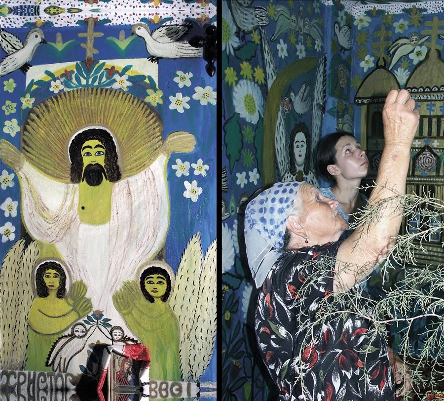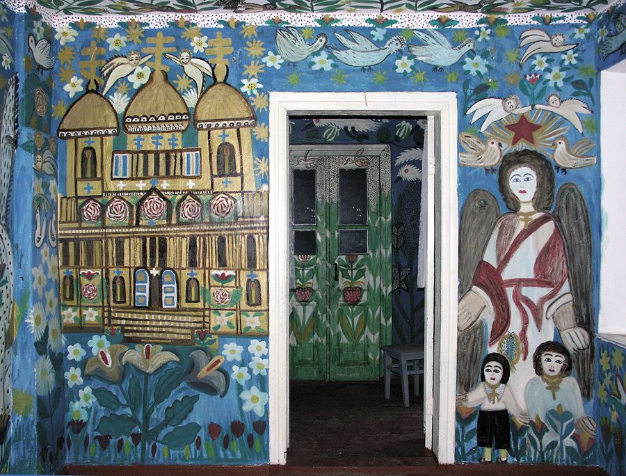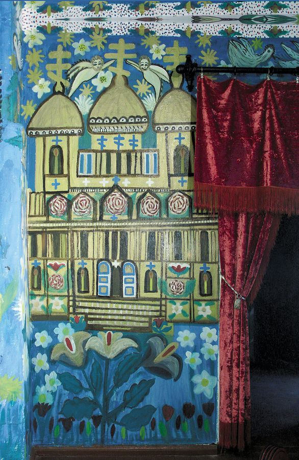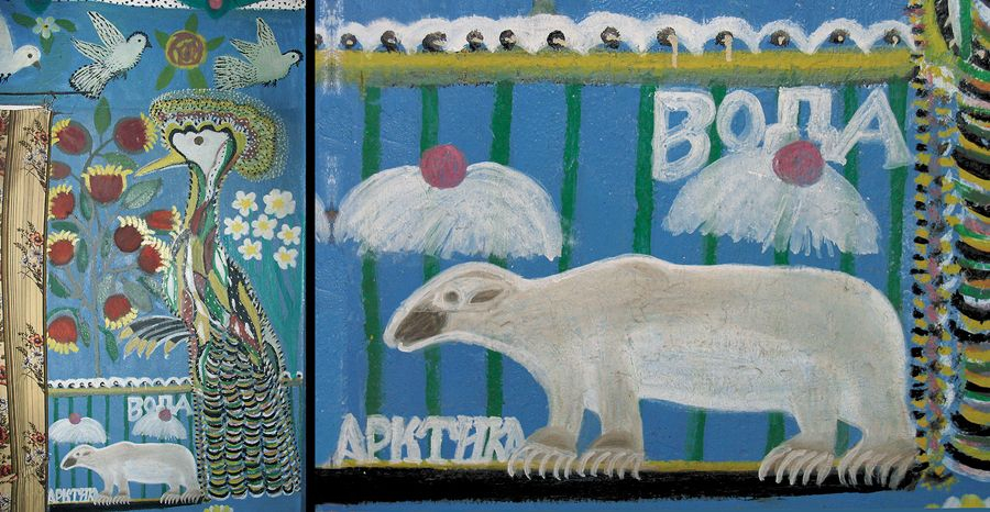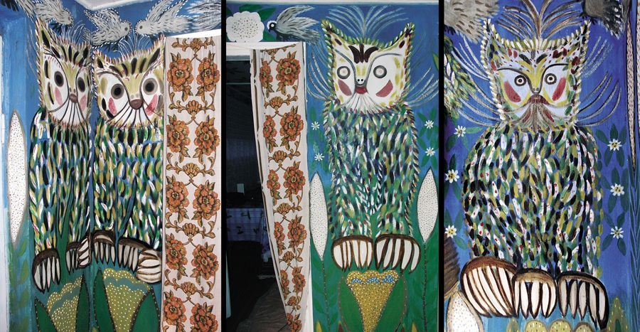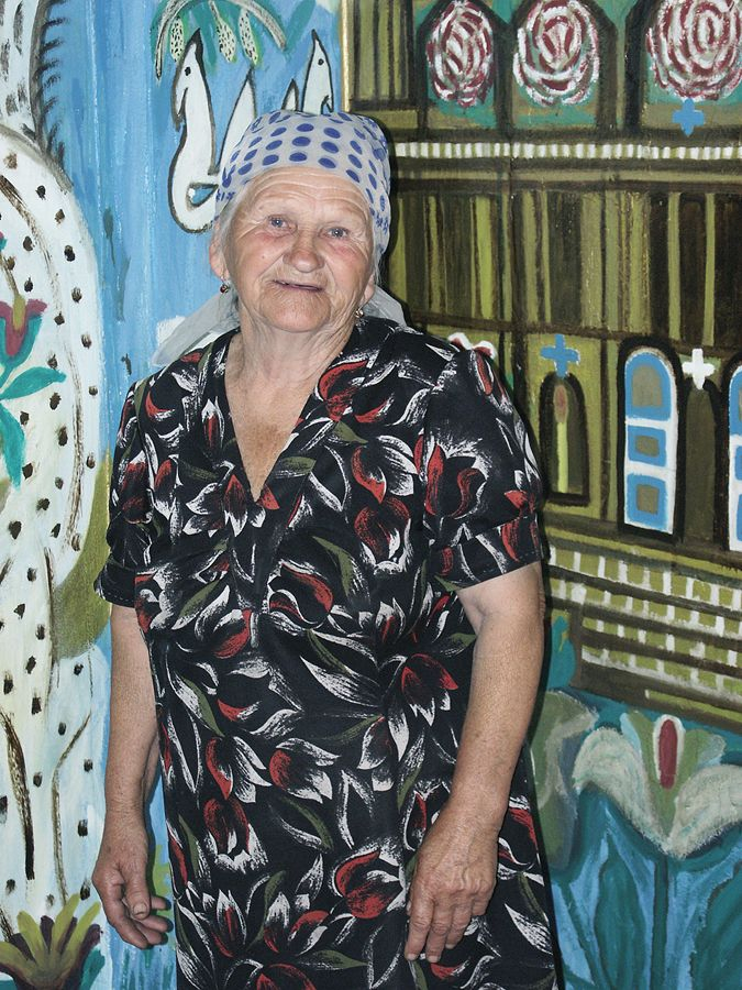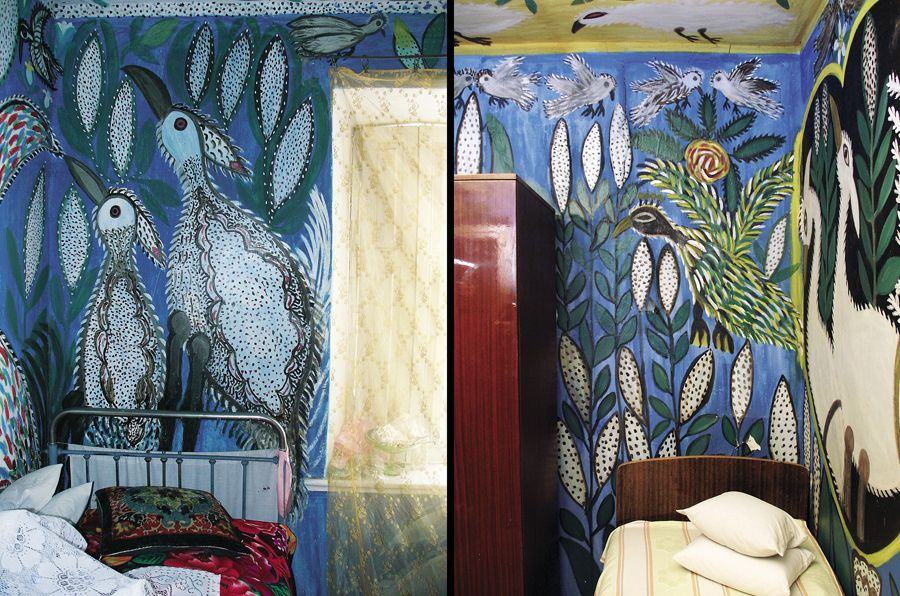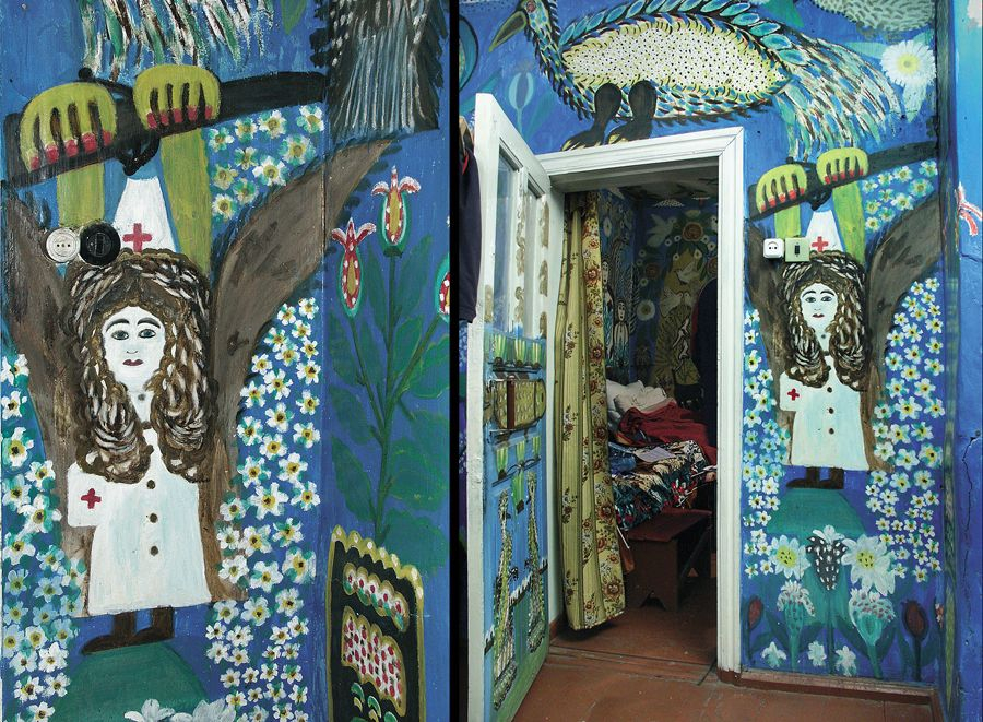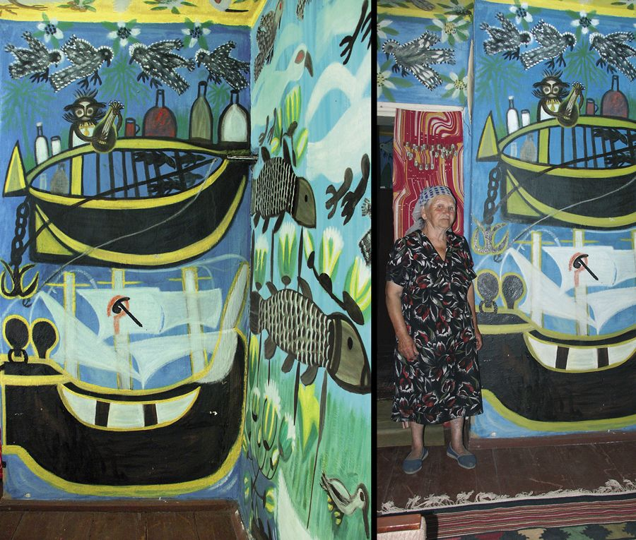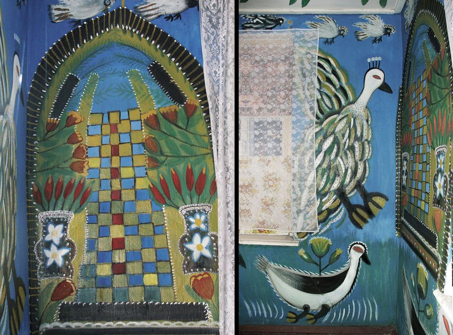 Первые композиции на стенах дома появились осенью в 1998 году, через три года после смерти мужа, когда сын Сергей находился в исправительной колонии. Полина Андреевна осталась одна, пыталась как-то собраться с мыслями, навести порядок в хозяйстве. «Все равно нужно было подмазывать и подкрашивать стены, - вспоминала Полина Андреевна, - вот и думаю, дай-ка попробую что-нибудь нарисую, что б душе было веселее». А радость не приходила: каждая новая композиция рождалась со слезами на глазах: «Чтоб не плакать, я начала петь. Стою на столе, рисую и пою: дом-то пустой». Соседи думали, что бабушка сошла с ума, но рисунки многим нравились.