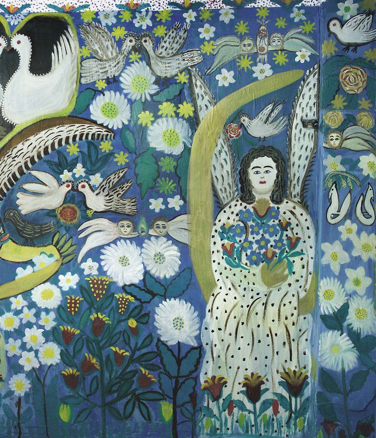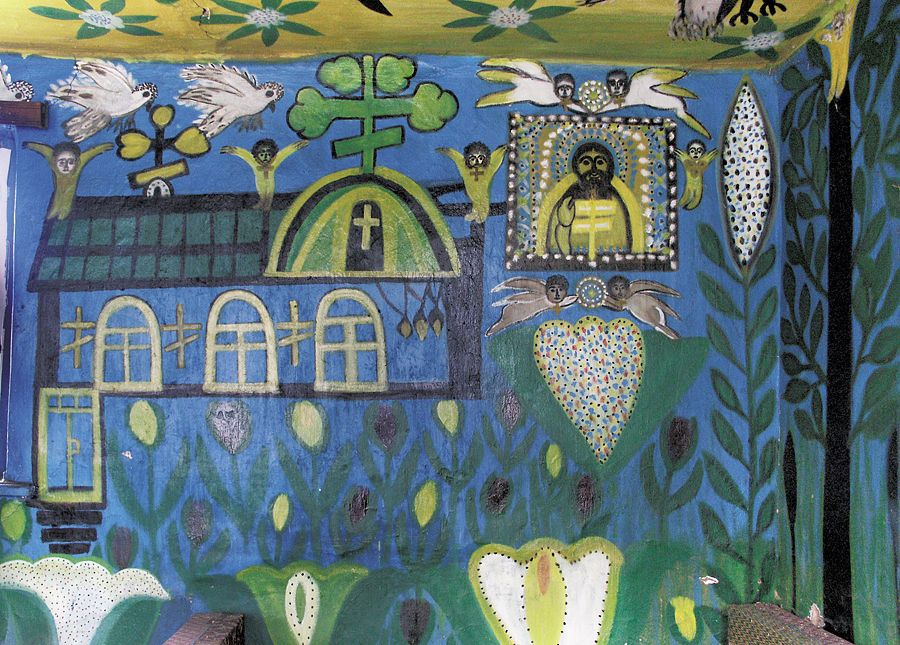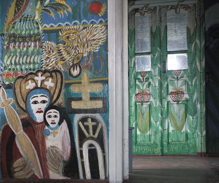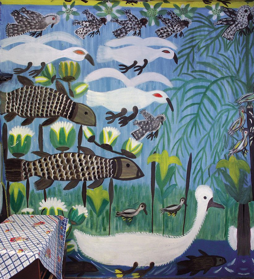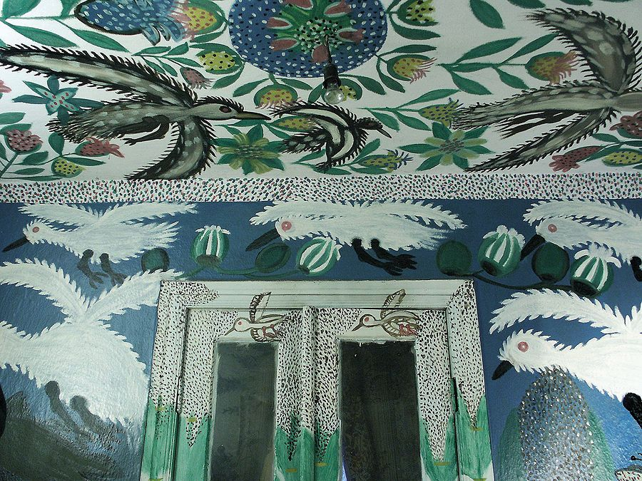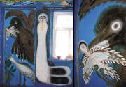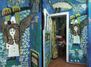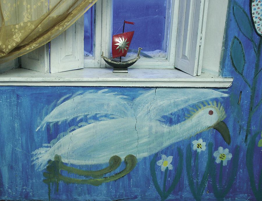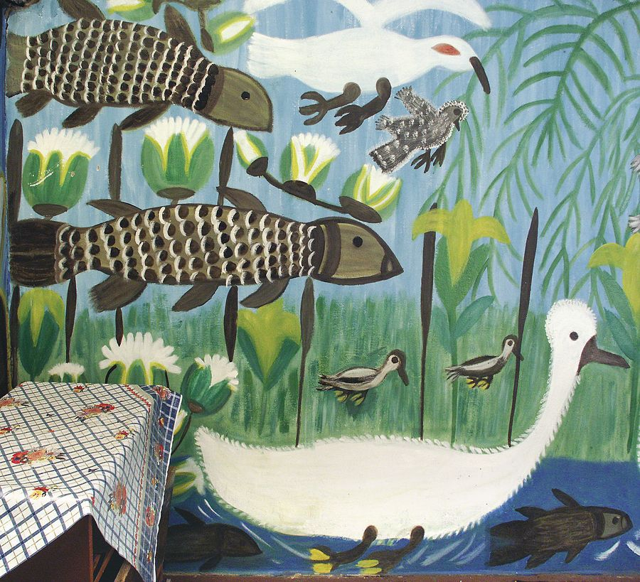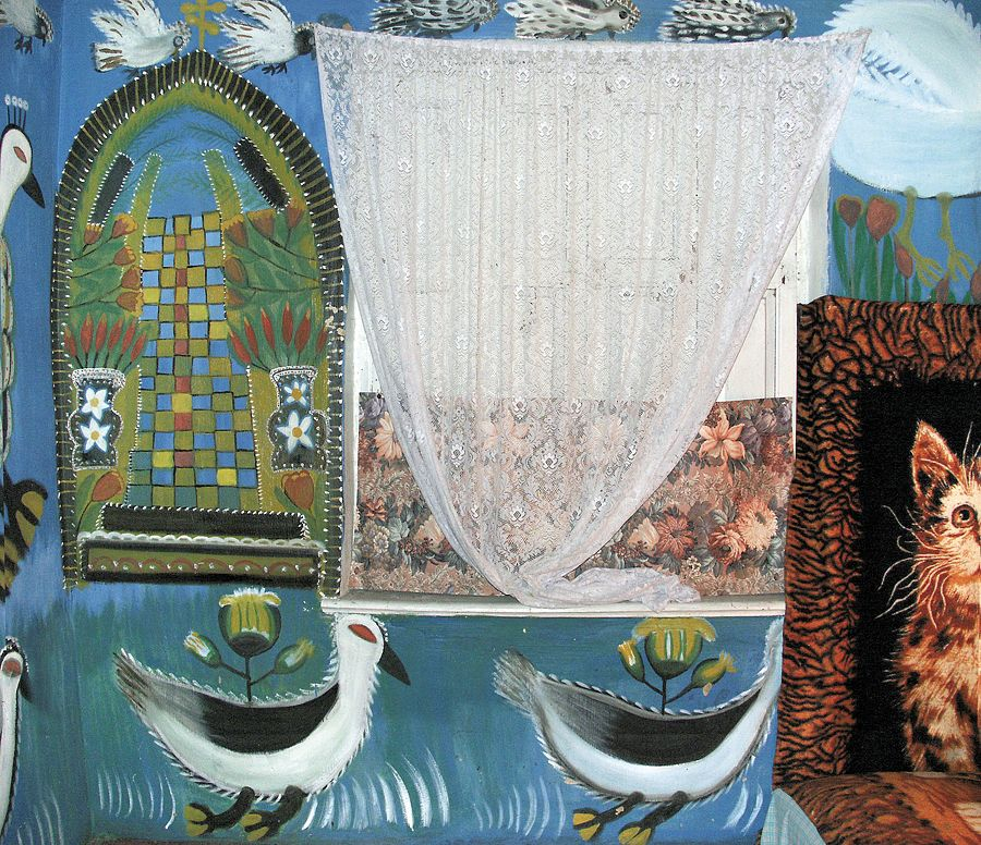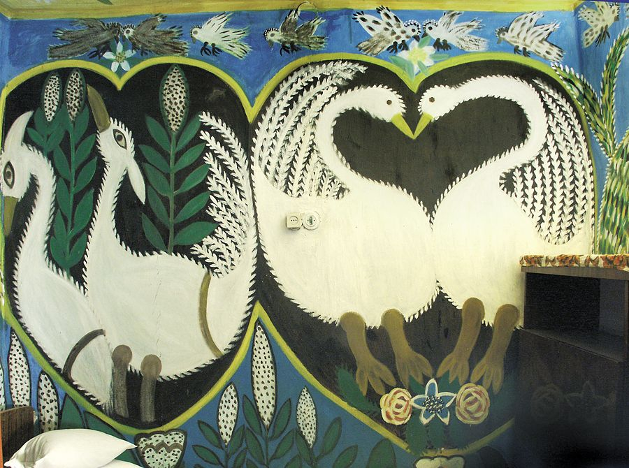 Первые композиции на стенах дома появились осенью в 1998 году, через три года после смерти мужа, когда сын Сергей находился в исправительной колонии. Полина Андреевна осталась одна, пыталась как-то собраться с мыслями, навести порядок в хозяйстве. «Все равно нужно было подмазывать и подкрашивать стены, - вспоминала Полина Андреевна, - вот и думаю, дай-ка попробую что-нибудь нарисую, что б душе было веселее». А радость не приходила: каждая новая композиция рождалась со слезами на глазах: «Чтоб не плакать, я начала петь. Стою на столе, рисую и пою: дом-то пустой». Соседи думали, что бабушка сошла с ума, но рисунки многим нравились.