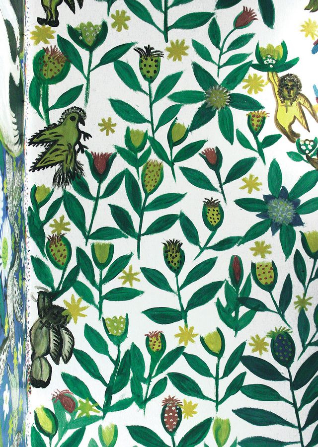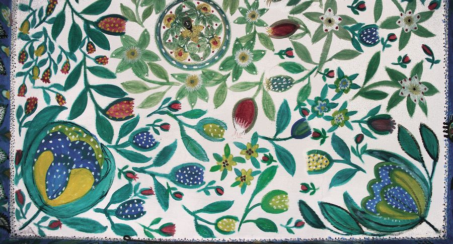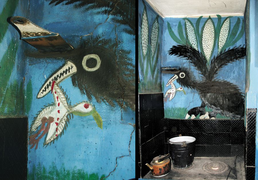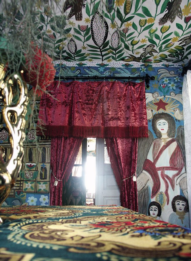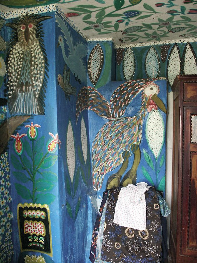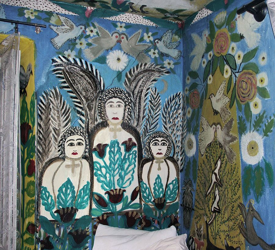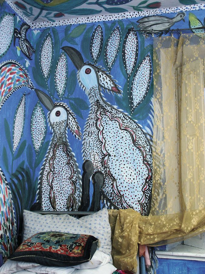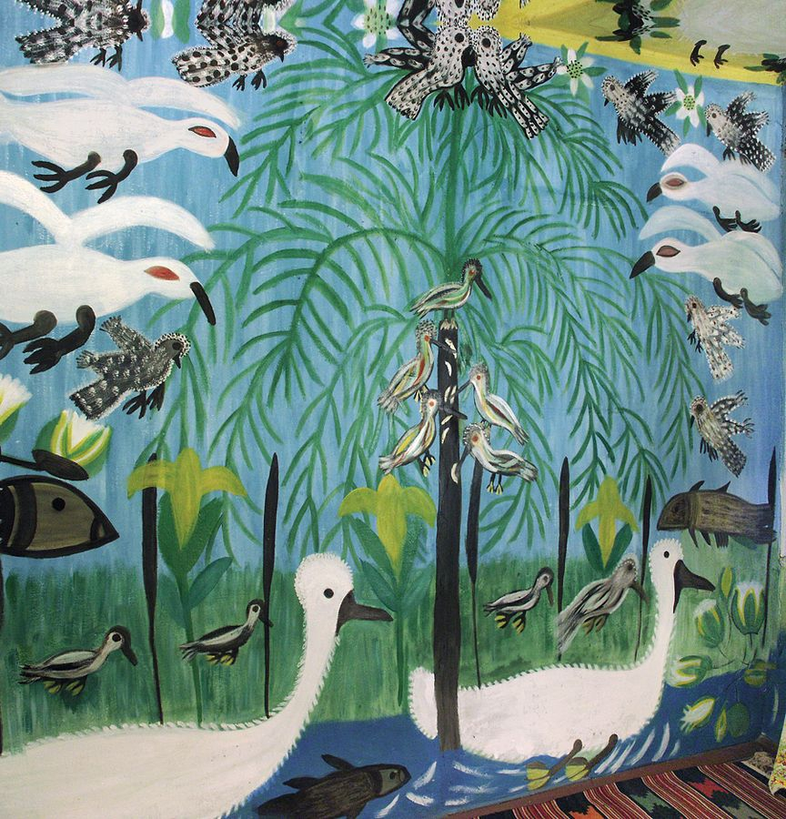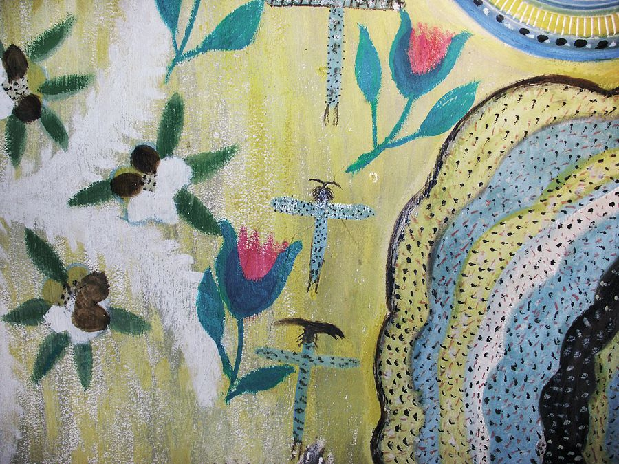 Первые композиции на стенах дома появились осенью в 1998 году, через три года после смерти мужа, когда сын Сергей находился в исправительной колонии. Полина Андреевна осталась одна, пыталась как-то собраться с мыслями, навести порядок в хозяйстве. «Все равно нужно было подмазывать и подкрашивать стены, - вспоминала Полина Андреевна, - вот и думаю, дай-ка попробую что-нибудь нарисую, что б душе было веселее». А радость не приходила: каждая новая композиция рождалась со слезами на глазах: «Чтоб не плакать, я начала петь. Стою на столе, рисую и пою: дом-то пустой». Соседи думали, что бабушка сошла с ума, но рисунки многим нравились.