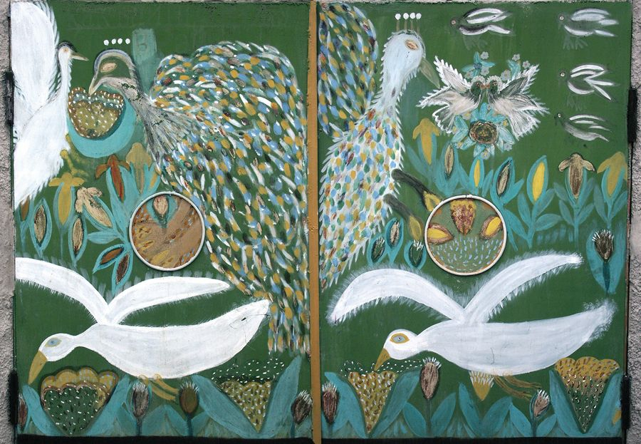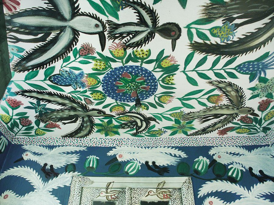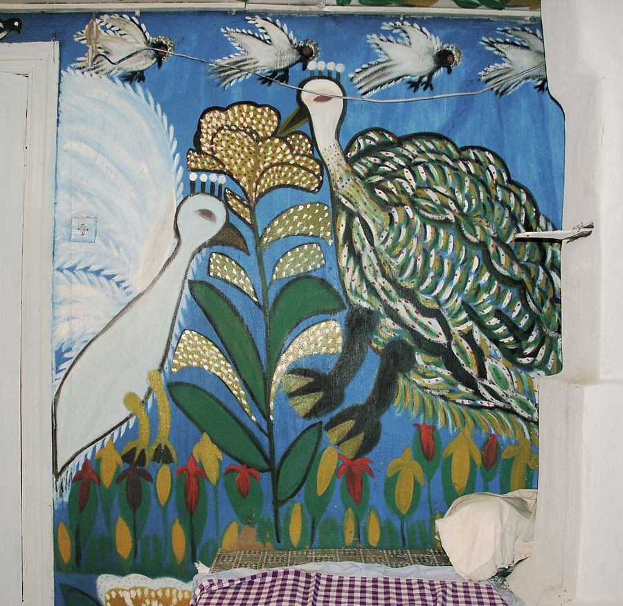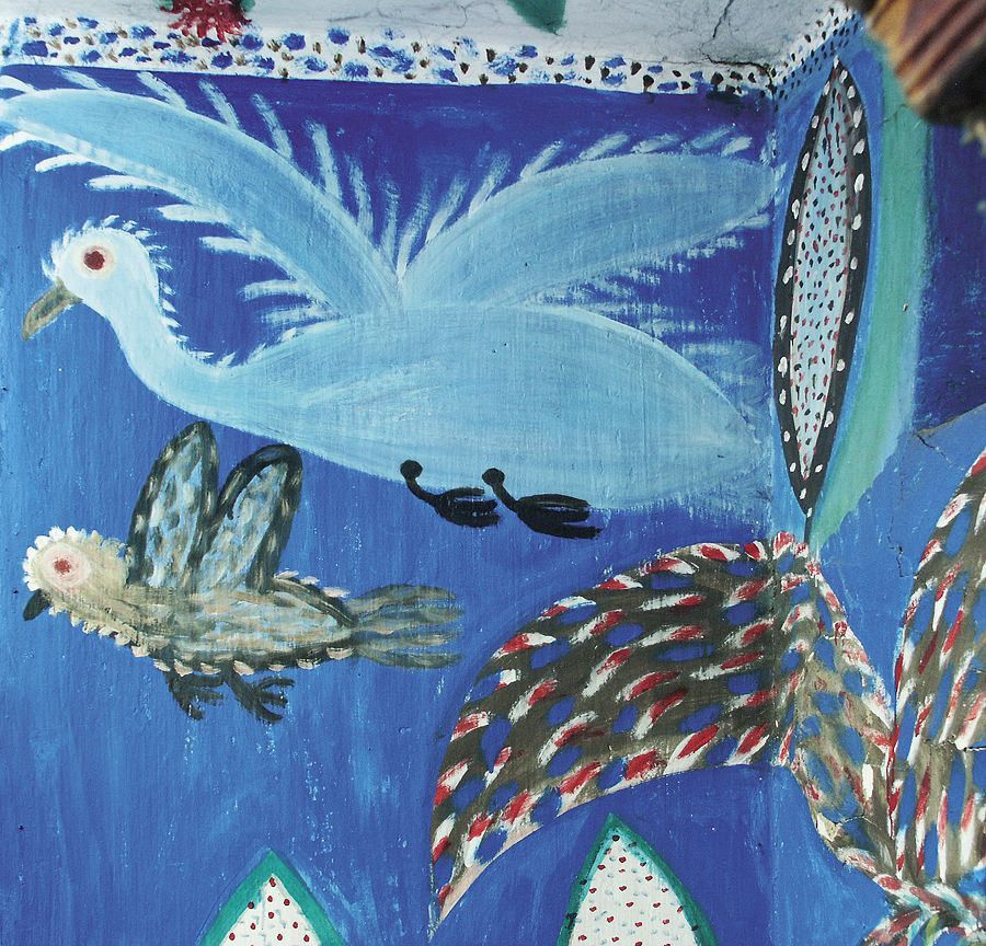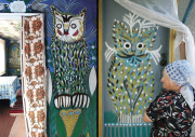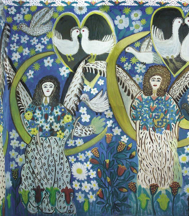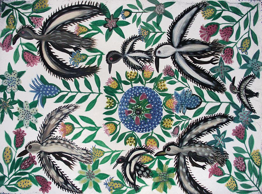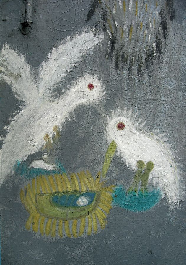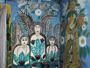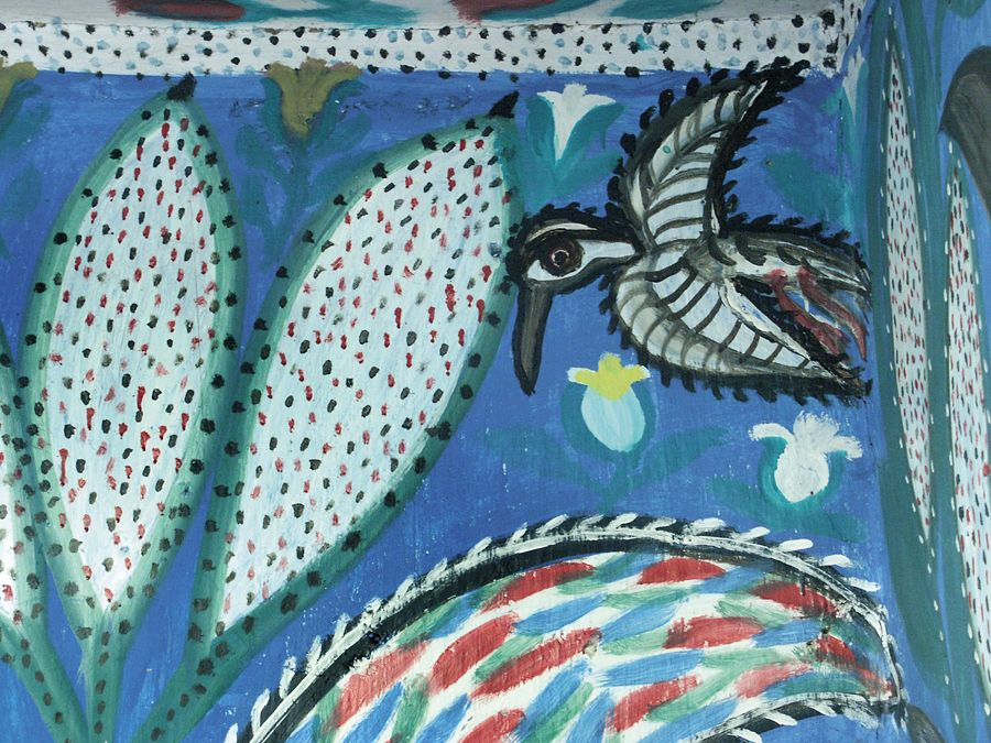 Первые композиции на стенах дома появились осенью в 1998 году, через три года после смерти мужа, когда сын Сергей находился в исправительной колонии. Полина Андреевна осталась одна, пыталась как-то собраться с мыслями, навести порядок в хозяйстве. «Все равно нужно было подмазывать и подкрашивать стены, - вспоминала Полина Андреевна, - вот и думаю, дай-ка попробую что-нибудь нарисую, что б душе было веселее». А радость не приходила: каждая новая композиция рождалась со слезами на глазах: «Чтоб не плакать, я начала петь. Стою на столе, рисую и пою: дом-то пустой». Соседи думали, что бабушка сошла с ума, но рисунки многим нравились.