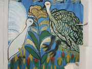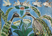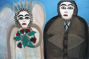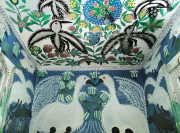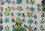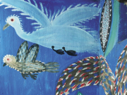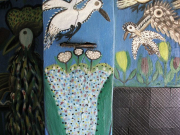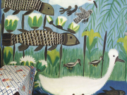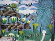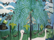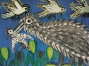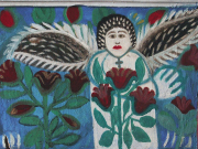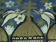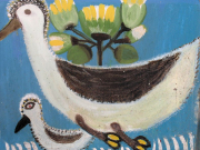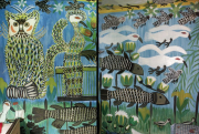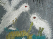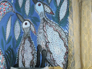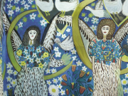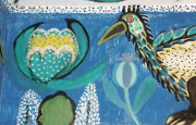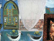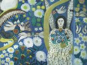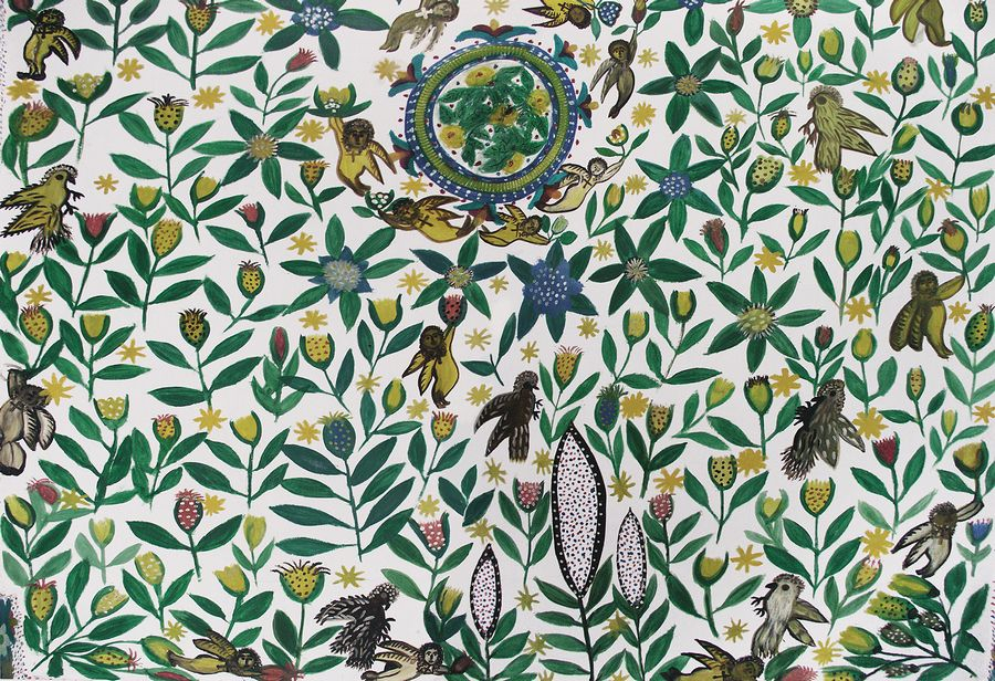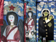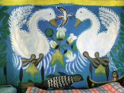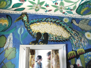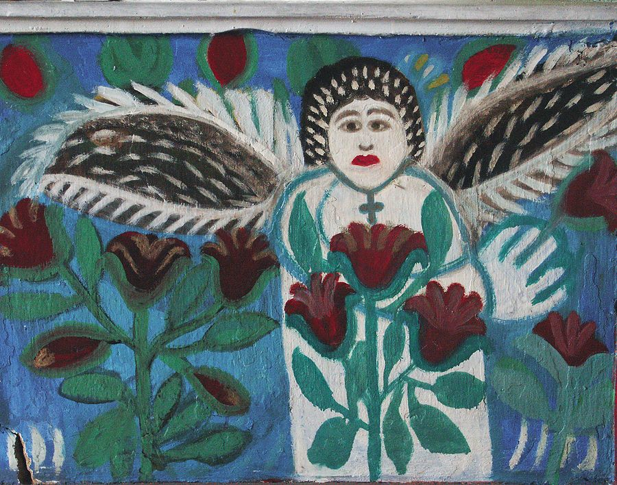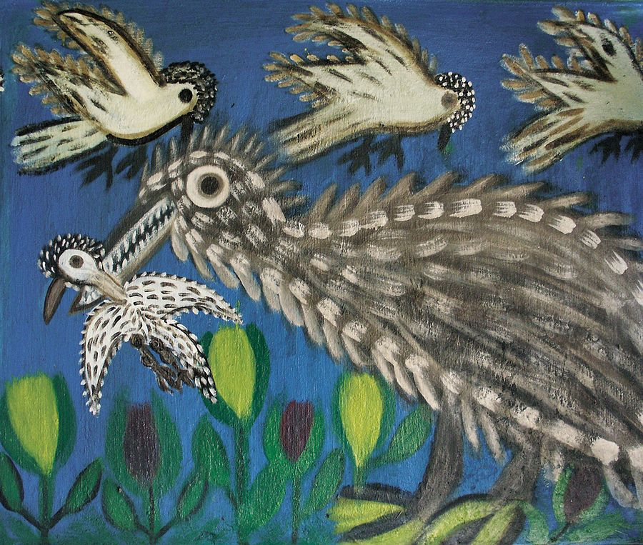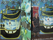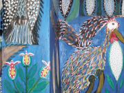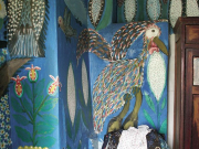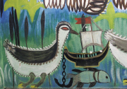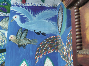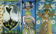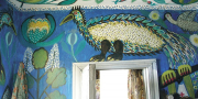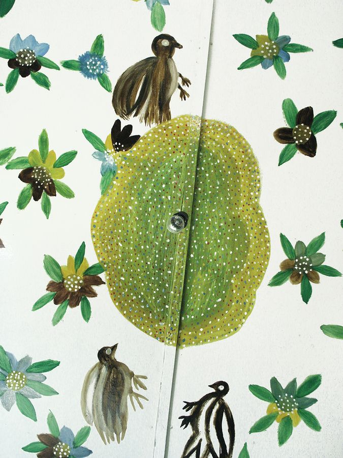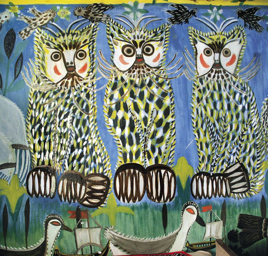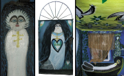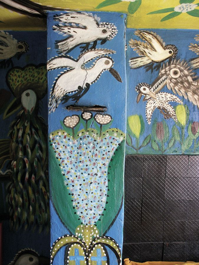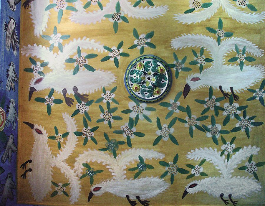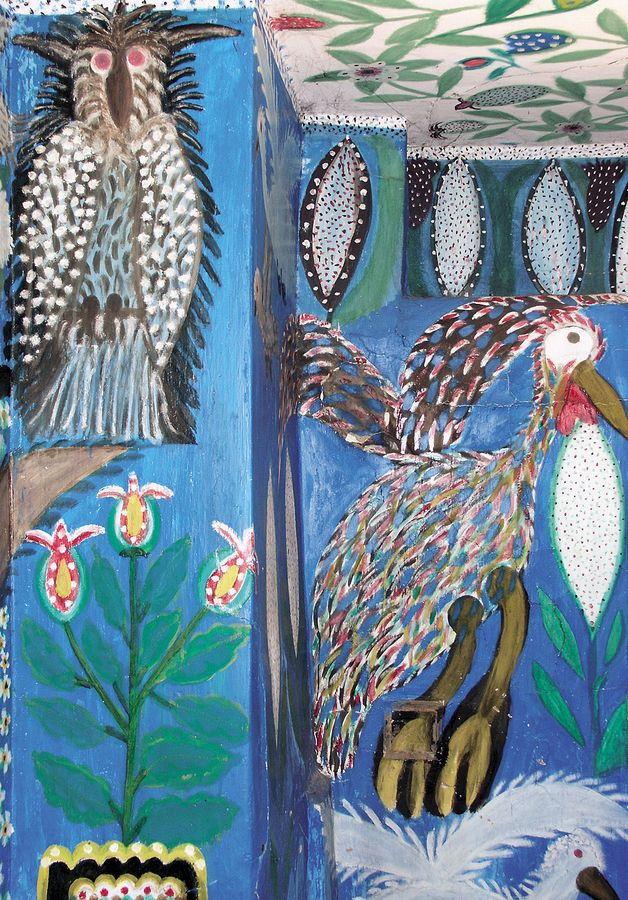 Первые композиции на стенах дома появились осенью в 1998 году, через три года после смерти мужа, когда сын Сергей находился в исправительной колонии. Полина Андреевна осталась одна, пыталась как-то собраться с мыслями, навести порядок в хозяйстве. «Все равно нужно было подмазывать и подкрашивать стены, - вспоминала Полина Андреевна, - вот и думаю, дай-ка попробую что-нибудь нарисую, что б душе было веселее». А радость не приходила: каждая новая композиция рождалась со слезами на глазах: «Чтоб не плакать, я начала петь. Стою на столе, рисую и пою: дом-то пустой». Соседи думали, что бабушка сошла с ума, но рисунки многим нравились.