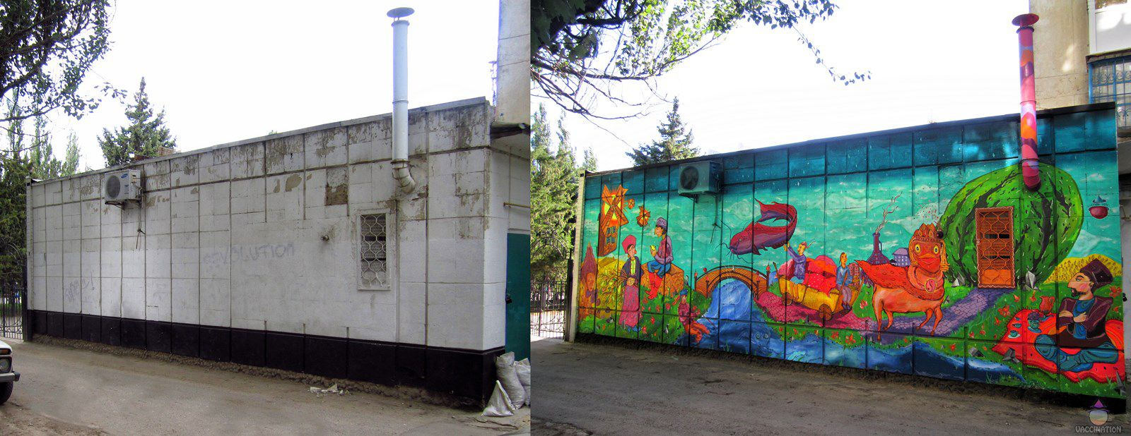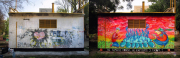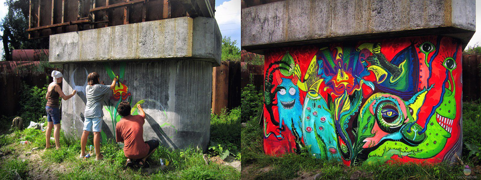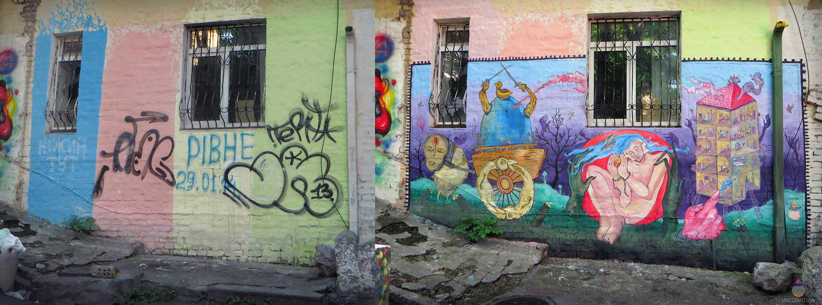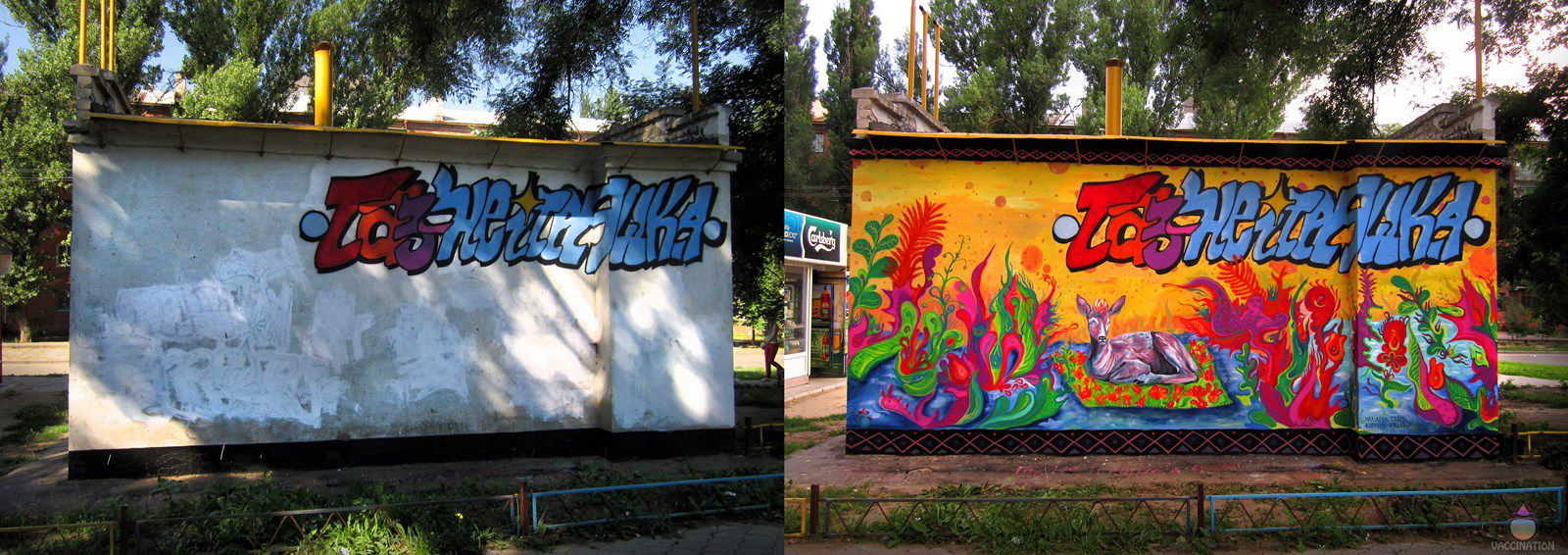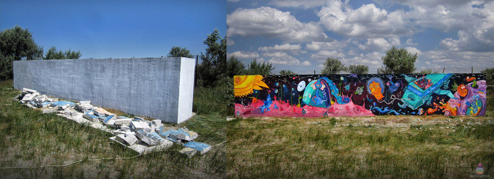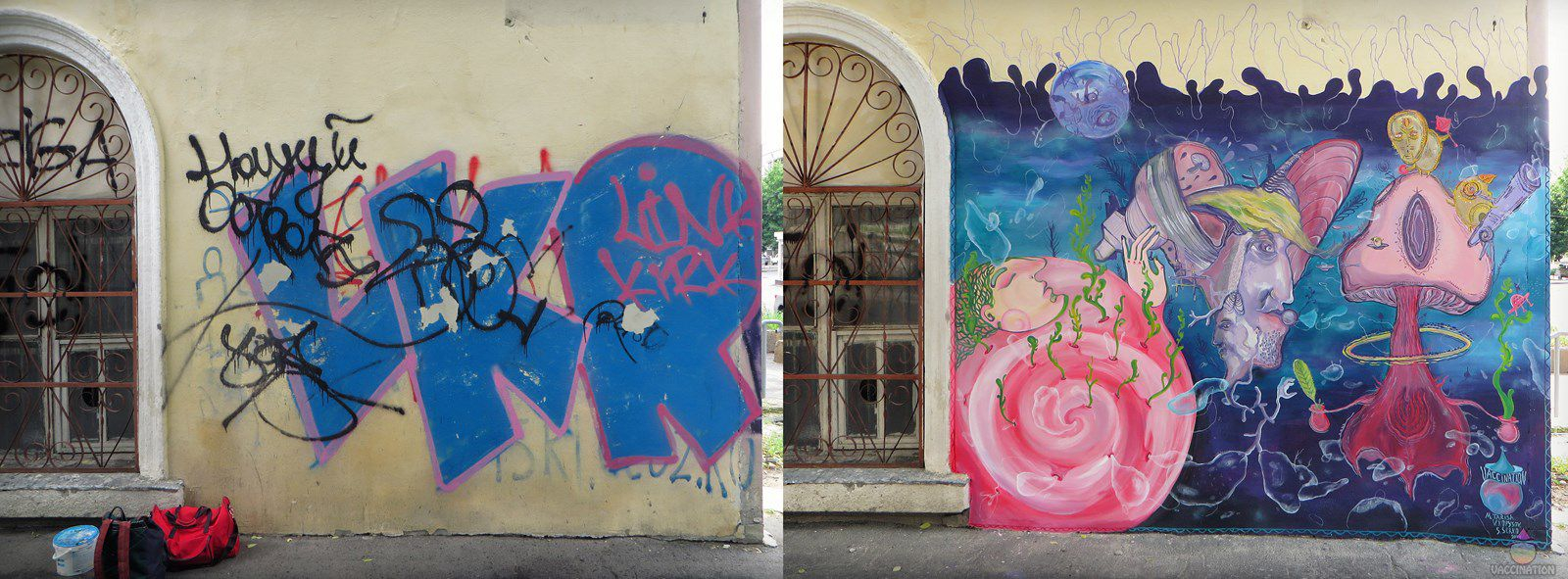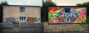 Наши "полотна" зачастую отличаються своими цветами, текстурой и поведением... Одни из них приходиться по пол дня выдраивать шпателем, и чиститить наждаком от "налета старины" или плохой покраски, другие "отдаються" с первого прикосновения, а какие-то по кучу раз необходимо покрывать основой, что бы убрать нижние слои разных тегов. А бывают и совсем - геометрические, кубические, и до такой степени неровные поверхности для рисования - что иногда сам удивляешься, как пролез кисточкой в такую щель. Вообщем мы решили создать серию фото, на которой можно ознакомиться со стенками "до" нашего вмешательства, и после него.