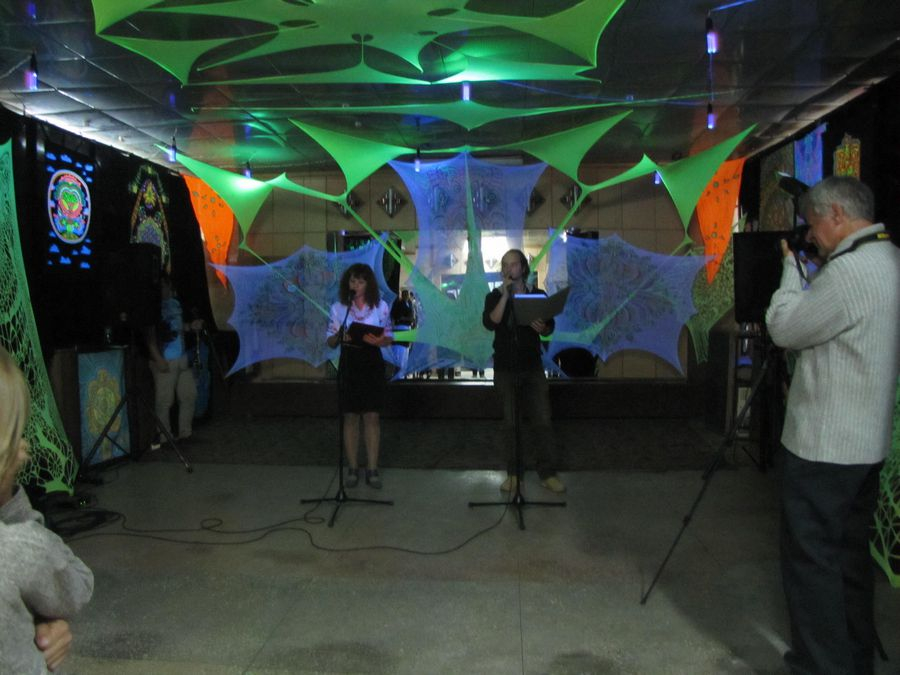 Это, увы, не самое неприятное на библиотечных арт-тусах. Вот все вроде хорошо, а местами и весело. Но этот неизбывный «пионерско-комсомольский» формат и соответствующий пафос, коим все это окрашено и пронизано, наводят экзистенциальную тоску. Когда ведущая торжественно провозглашает «А сейчас слово предоставляется…», хочется немедленно оказаться в другом, менее торжественном пространстве. А такое, слава современным художникам, нашлось.
