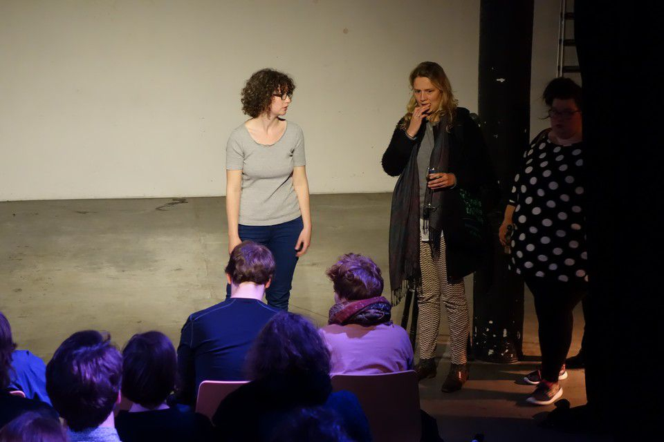 А теперь об основных месседжах феста. Его тема в этот раз - «(Wie) wollen wir in Zukunft arbeiten?» («(Как) мы хотим работать в будущем?»). То есть, «Какую роль искусство может играть для труда в будущем?», «Каковы пожелания и идеи молодых художников для их будущего?», «Как мы можем организоваться и вообще, кто это «мы»? Этакий «фьючерсный» диспут о нормах и условиях труда творческой единицы. Эти вопросы обстоятельно, с показом фильмов и лекциями от известных европейских экспертов и художников, обсуждались на трансдисциплинарном конгрессе. Но «говорильня» была не единственной формой представления своих видений – прямо или косвенно, эти темы, наряду с экологическими проблемами, расовой и гендерной ненавистью и прочими социально-политическими «негараздами», презентовались в виде перформансов и спектаклей. Кои нас буквально «порвали» - качеством и разнообразием перформтивных форм в рамках одной постановки. А ведь это студенты, на минуточку. Есть чему учиться, на самом деле.