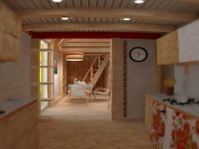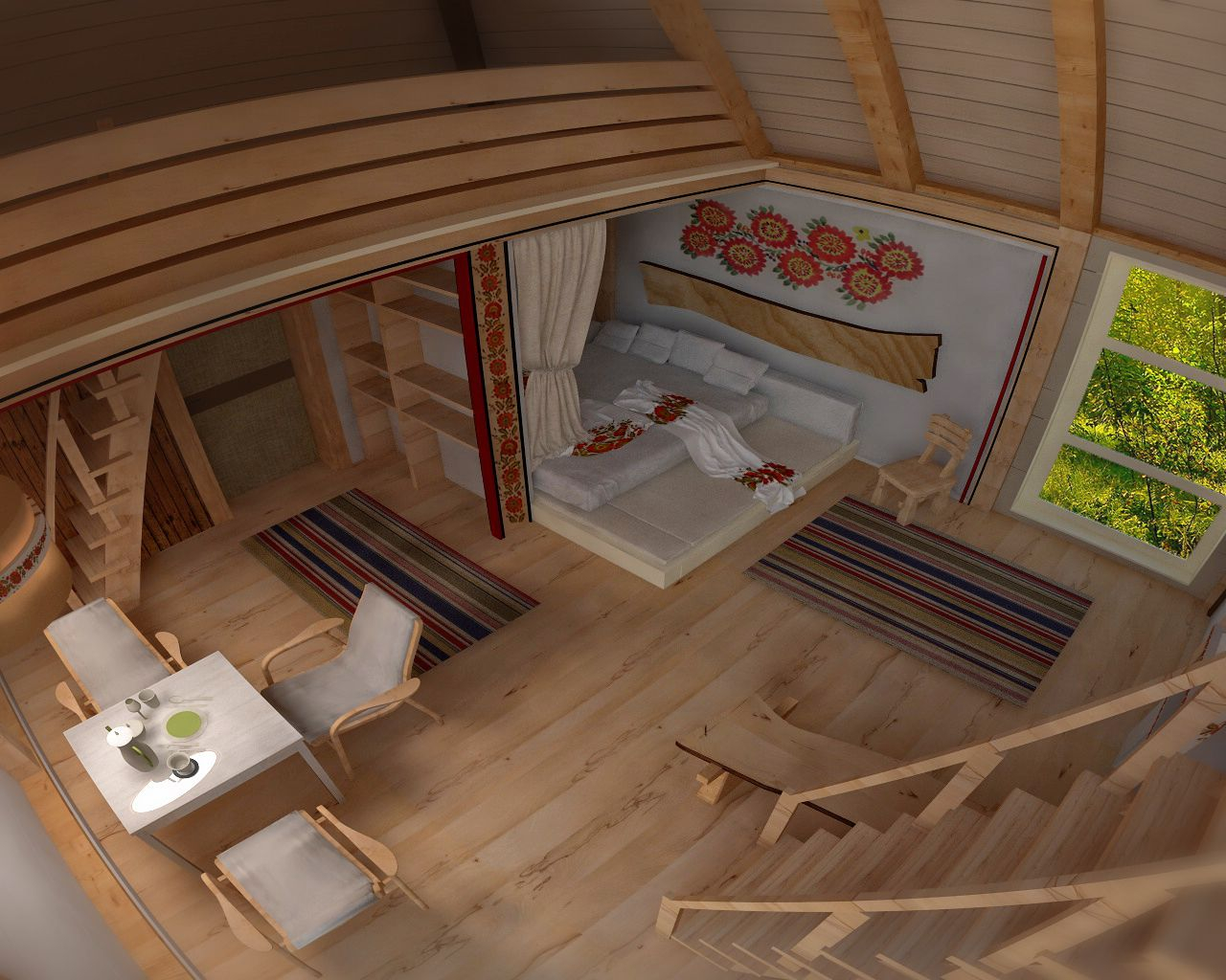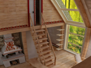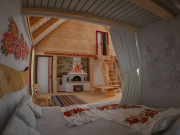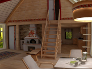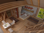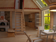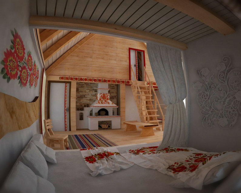Экологичность хаты не только в использовании эко-материалов, но и в особой системе обогрева и нагрева воды. Но этой системы в доме не видно, ее и в проекте не видно, потому что она засекречена. Расположение спального уголка в общей комнате – будоражит воображение, наверняка здесь личное предпочтение и какая-то романтическая история, которую очень хочется послушать.