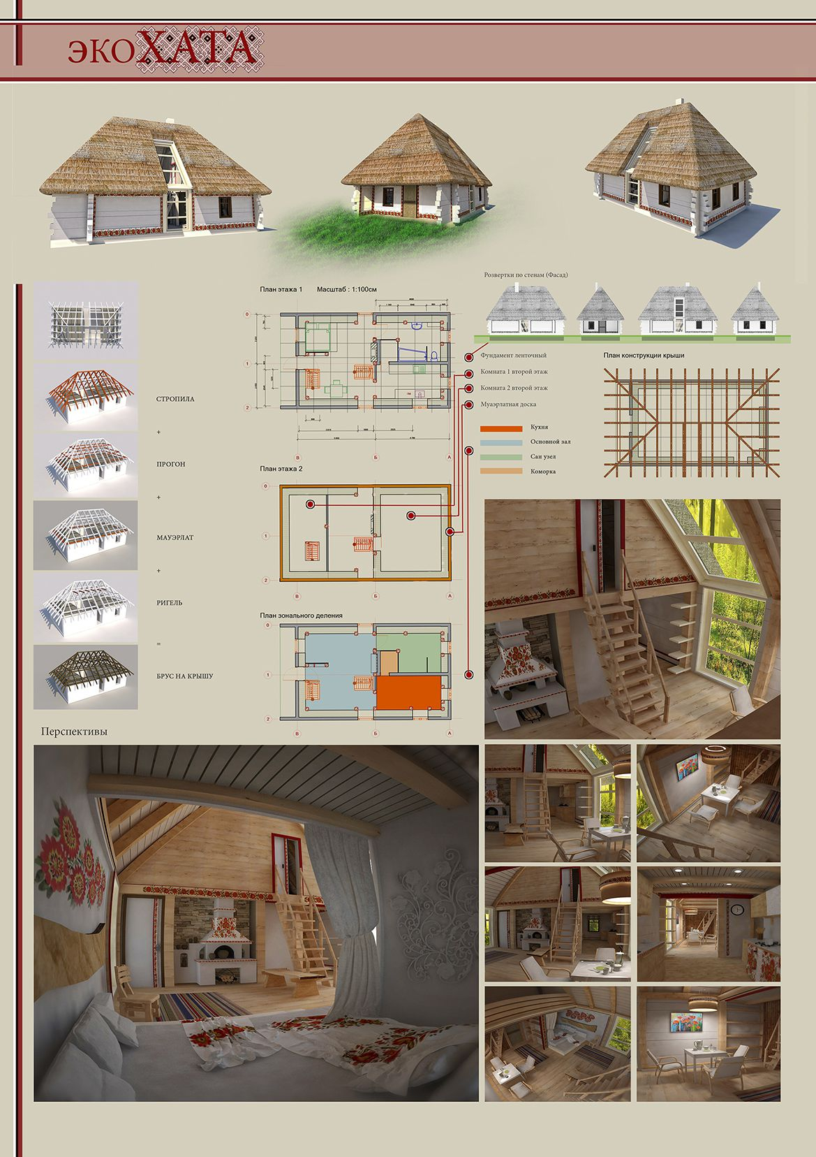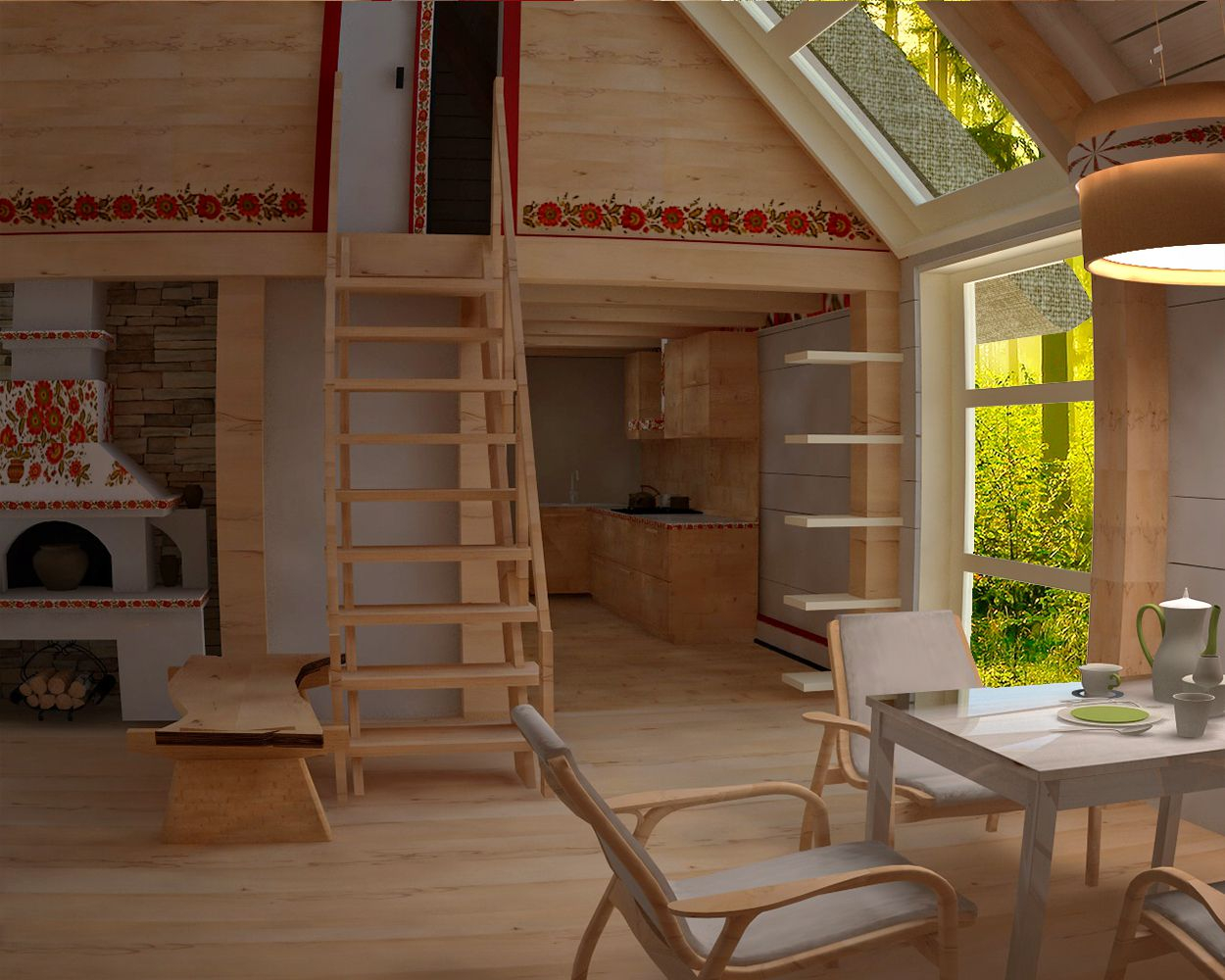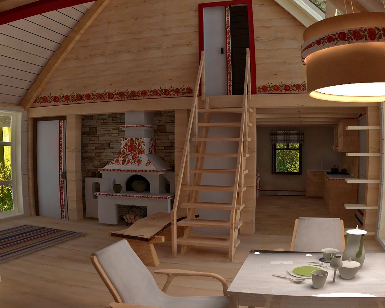 В ногу со временем шагнул и Артур Айметов, включившись в процесс. Экохата, уже в том эко, что хата, а не просто дом или изба. Потому что традиции. Традиции в досках, в глине, в соломе, и даже в росписях. Правда, автор считает, что в традиционном виде использование национальных мотивов не уместно. Но как же стилизации солнышка, деревьев жизни, птичек – посредников между небом и людьми и др. Грустно без них. Солнца, допустим, в доме много, куда еще солярные символы? Но в данном случае, в таком лаконичном решении – как насчет резьбы? – В виде сплошных орнаментальных полосок неглубокой резки, а то и сквозной резьбы в узких плоскостях – стилизованных витинанок.