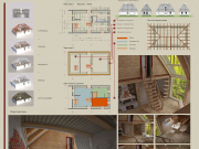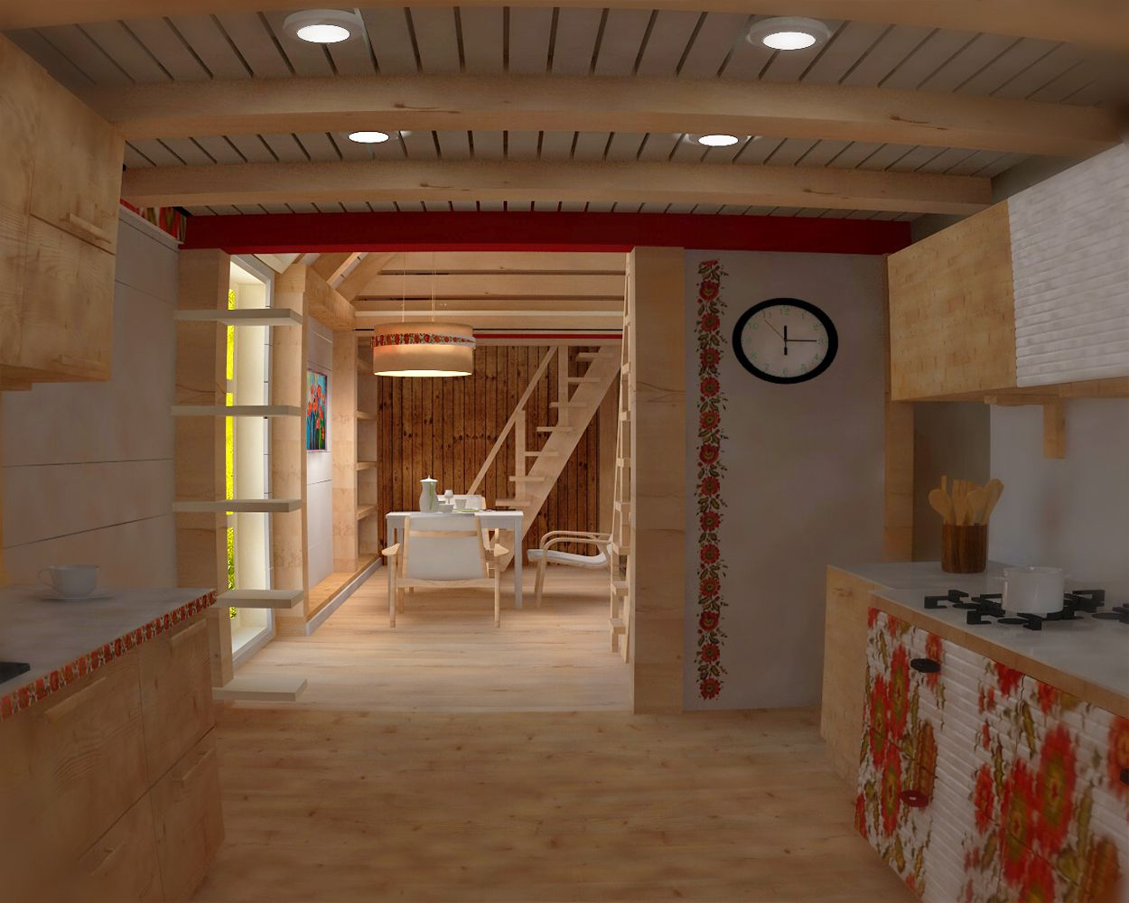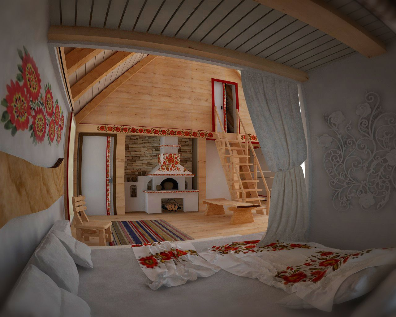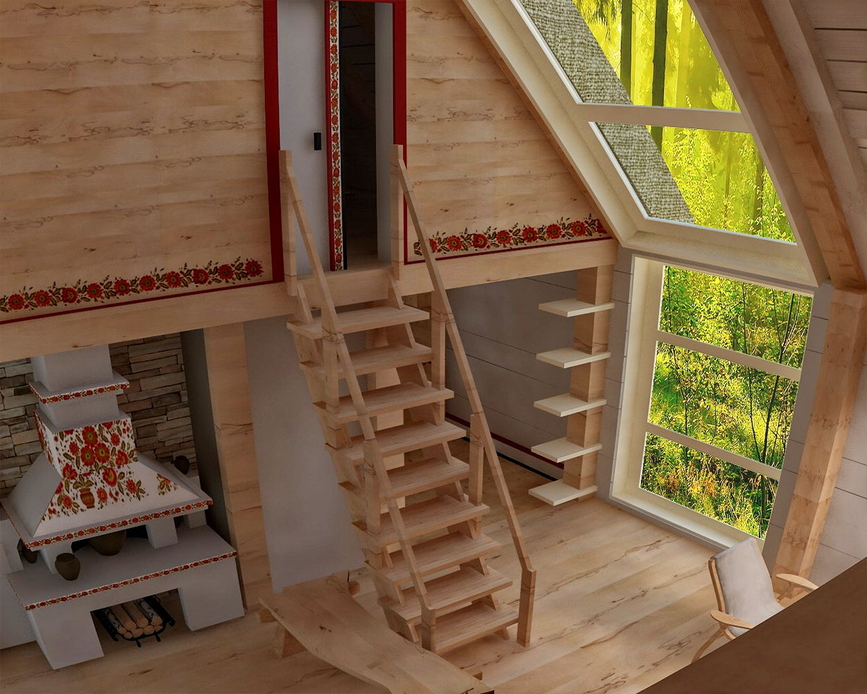 В ногу со временем шагнул и Артур Айметов, включившись в процесс. Экохата, уже в том эко, что хата, а не просто дом или изба. Потому что традиции. Традиции в досках, в глине, в соломе, и даже в росписях. Правда, автор считает, что в традиционном виде использование национальных мотивов не уместно. Но как же стилизации солнышка, деревьев жизни, птичек – посредников между небом и людьми и др. Грустно без них. Солнца, допустим, в доме много, куда еще солярные символы? Но в данном случае, в таком лаконичном решении – как насчет резьбы? – В виде сплошных орнаментальных полосок неглубокой резки, а то и сквозной резьбы в узких плоскостях – стилизованных витинанок.