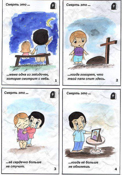 Погуглив мнения разных психологов, удивилась тому, насколько эта тема слабо и поверхностно затронута. Психологи почти все в один голос заявляют, что ребенок прекрасно воспримет эту информацию, в основном, все советы сводятся к тому, что надо обязательно ребенку сказать что любимая собачка (кошечка, бабушка,тетя) умерла, а не "убежала". Но что делать, если ребенок задаст вопрос "а я тоже когда-то умру? И ты мама?" психологи ничего внятного не придумали. Единственное конкретное, что пишут, мол, религиозным семьям в этом смысле больше повезло. На мамских форумах советуют, рассказывать ребенку, что мы все становимся звездочками на небе, что Бог нас к себе позвал, про рай, ангелов и т.д. Но многие дети интересующиеся смертью, уже не верят в "полеты на небеса".