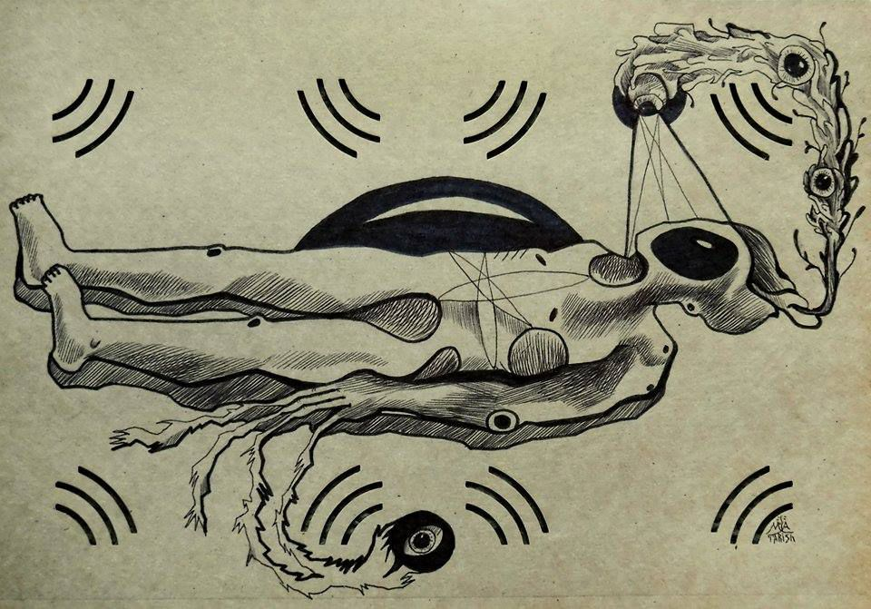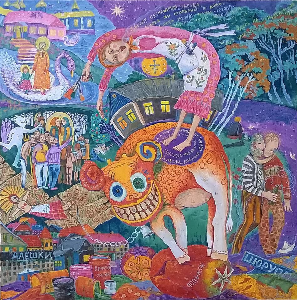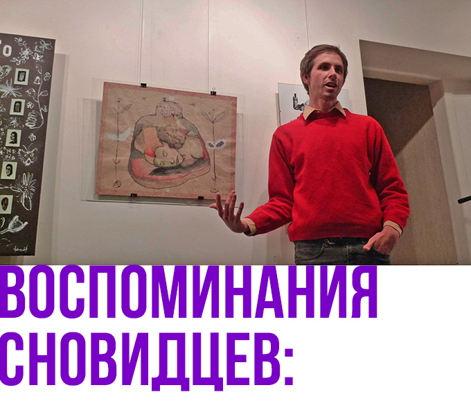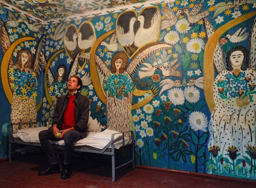 «Как только я зашёл в дом, сразу за секунду выключился дневной свет, и я оказался в окружении разрисованного дома. Я поздоровался с ангелами и с птицами, дав им понять, что я свой человек и никакой угрозу не несу. Как голодный турист, я сразу всё от фотографировал и рассмотрел с пеной во рту, восхищаясь Полиной и её удивительным миром. После осмотра всего я решил порисовать и до поздней ночи рисовал, передавая энергетику места. В конце дома я обнаружил маленькую комнату, в которой стояла большая розовая кровать. Меня насторожило это место, я ощущал как Полина там сидит – и именно в эту секунду замигала лампочка, а потом и вовсе потухла. После этого я понял, что буду спать на кушетке в другой комнате. На следующий день Вячеслав Машницкий мне сказал, что на той койке Полину отпевали. Ночью мне снились совершенно разные сновидения – и про то, как я попал в тюрьму, рассказывая при этому сокамернику как это круто. И как я встретил одноклассницу, которая беременная. И ещё снилось голубое небо, в котором пролетают пушистые тучки в форме глаз. Но один из самых интересных: я иду по селу, и зовут меня мужики пропитого и деградирующего вида. Они трусили абрикосовое дерево, а один ко мне пристал с какими-то вопросами. Под ногами проползала змея, но никакой угрозы нашей жизни она не несла, но мужик просто заколол её из-за ненависти ко всему миру. На деревянной стене висело около пятнадцати змей подряд, и он прибил ещё одну.
