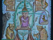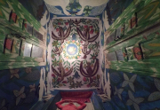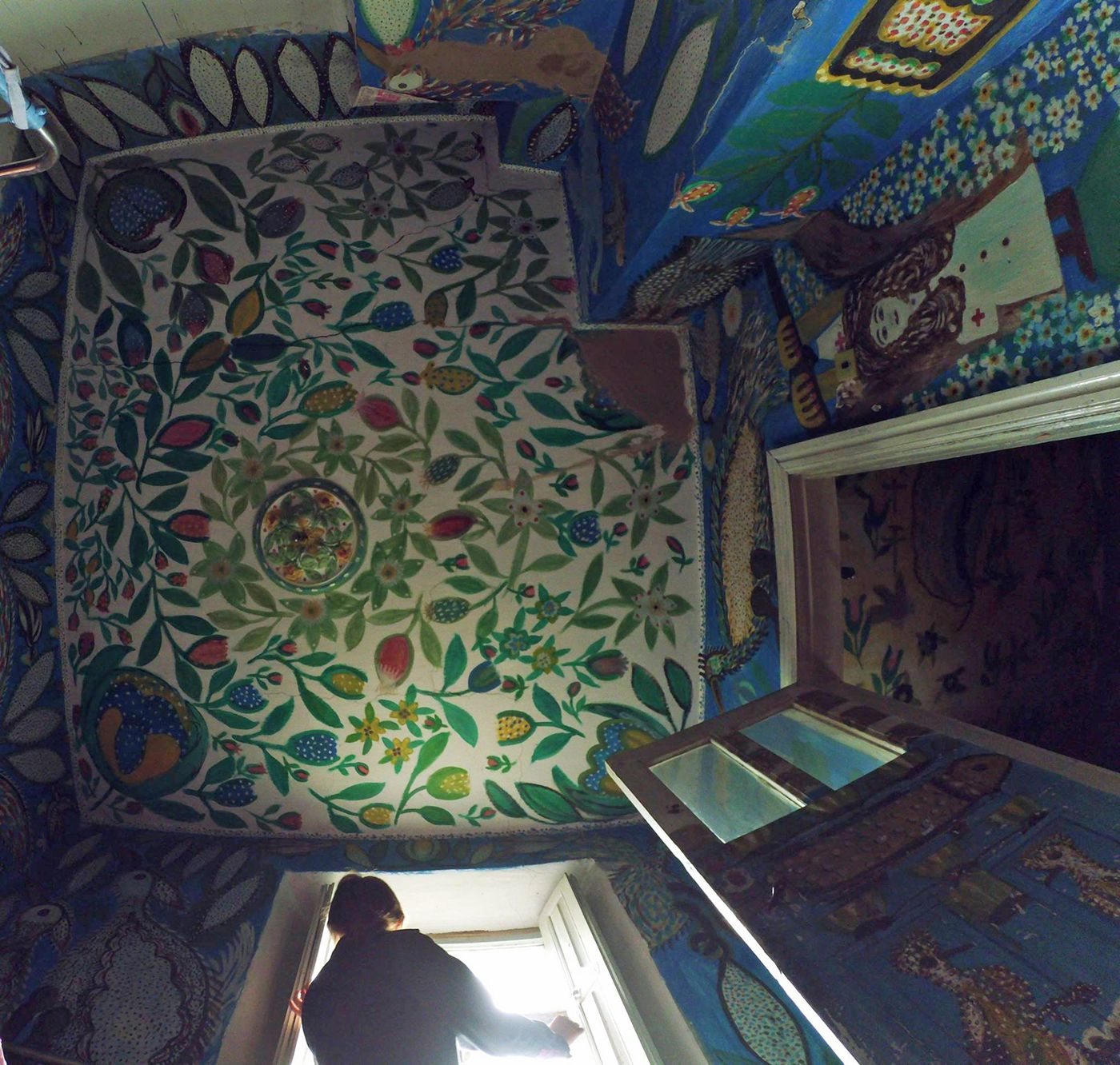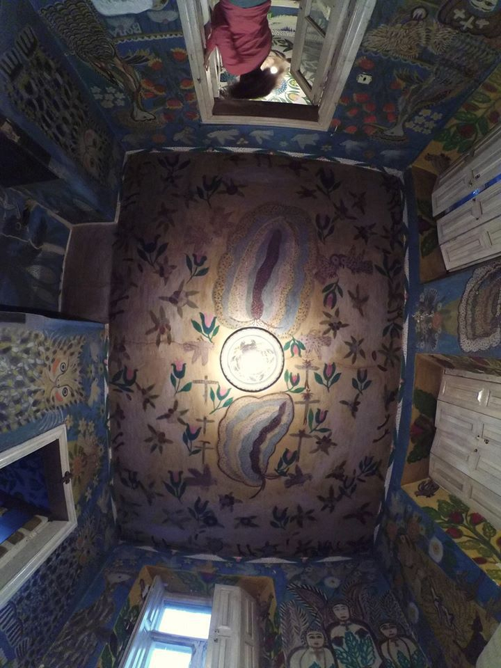 «Несмотря на то, что бабушка уже давно ушла из жизни (физической), весь дом (в буквальном смысле) пропитан её творчеством, а значит – и духом. Я ещё больше поняла, как важно оставить в этом мире после себя ЧТО-ТО ТАКОЕ!При входе, на улице, меня встретил белый разноглазый кот (один глаз зеленый, другой - синий), который с удовольствием угостился моей булкой с маком. Далее на велосипеде подъехал внук смотрительницы дома (которая в то время находилась в церкви), и открыл мне домик. Я переступила порог и начала рассматривать каждую комнату, а потом подняла голову вверх – и ещё больше офигела... Все-все потолки разрисованы. Ну вот откуда у пожилого человека столько сил и стремления, чтобы даже туда достать? Меня как художницу-муралистку (да-да) это удивляет ещё больше, так как недавно имела дело с росписью потолков, и осознаю все сложность и неудобство процесса. Так вот, не буду вдаваться в технические подробности, а приступлю к ощущениям...