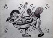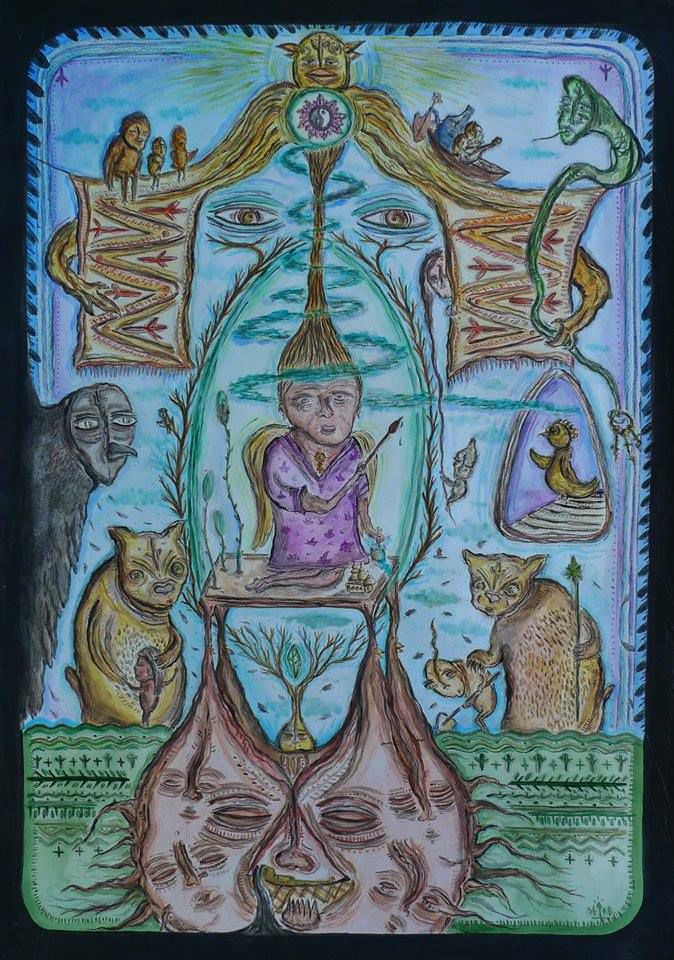 «Когда решилась поехать ночевать в дом, умышленно не стала искать о Полине Райко информацию, чтобы самостоятельно сформировать её образ. Сказать, что я была шокирована – ничего не сказать, случился какой-то ступор от увиденного. Обошла все комнаты, сразу решила, что буду спать на её кровати, ну чтоб наверняка сны по теме снились! Первое, что очень бросилось в глаза - это рты персонажей, почти все с опущенными уголками вниз. И глаза, которые будто написаны в ровно зеркальном отражении, если бы к одной части лица поднесли зеркало - вышла бы точная половина другой нарисованной части лица, так мне показалось. Страха не было вообще, дом очень добродушный. Признаюсь, думала, когда ехала, что бабушка была чуть не в своём уме. Но эта мысль полностью развеялась. Образы у неё не очень радостные, но весь дом цветёт как сад, и это уравновешивает грустные лики. На столе разложила всё необходимое для рисования, зажгла свечу не только, потому что дом к этому располагает, но и потому что света недостаточно, чтобы рисовать. Встала, когда закончила порядка 12 образов-миниатюр тушью, и должна сказать, что давно с таким удовольствием и легкостью не трудилась!