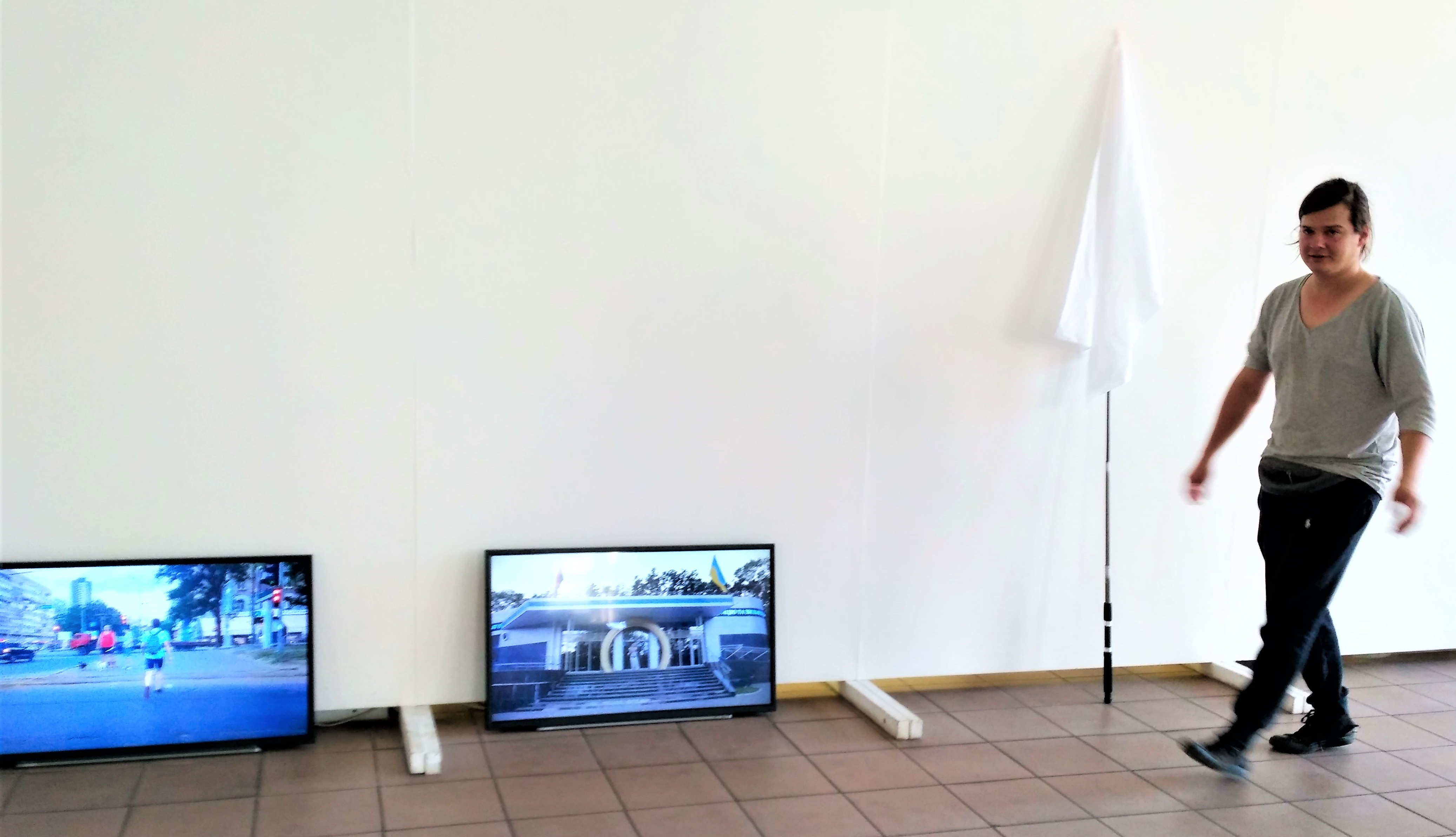 Это просто какой-то человек, которого мои знакомые встречали в разных местах страны. Я его увидел в Ужгороде, в ходе экспедиции, культурологического исследования (декоммунизация и ее последствия для провинциальных музеев). Чем-то (особого покроя штанами, что ли) похож на тренера по йоге. Он уверенно прорезал собой пространство. Видно, что у человека есть цель. Мне кажется, что он движется в абстрактный центр нашей родины. В метрополию. Мы его встретили в Днепре, когда снимали «Кикимору» Алины. В контакт с ним не входили. Незачем. Это просто интересная, но попутная история, которая где-то началась. Уникальна разе что повторная случайность этой встречи. Приехал в Днепр и снова на него напоролся. Из чего уже получается хроника. Человек во времена войны бегает с белым флагом. Средний палец может стать более грозным жестом...