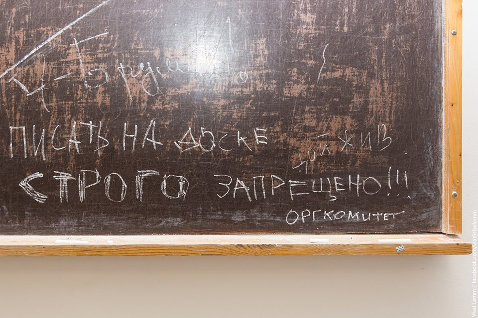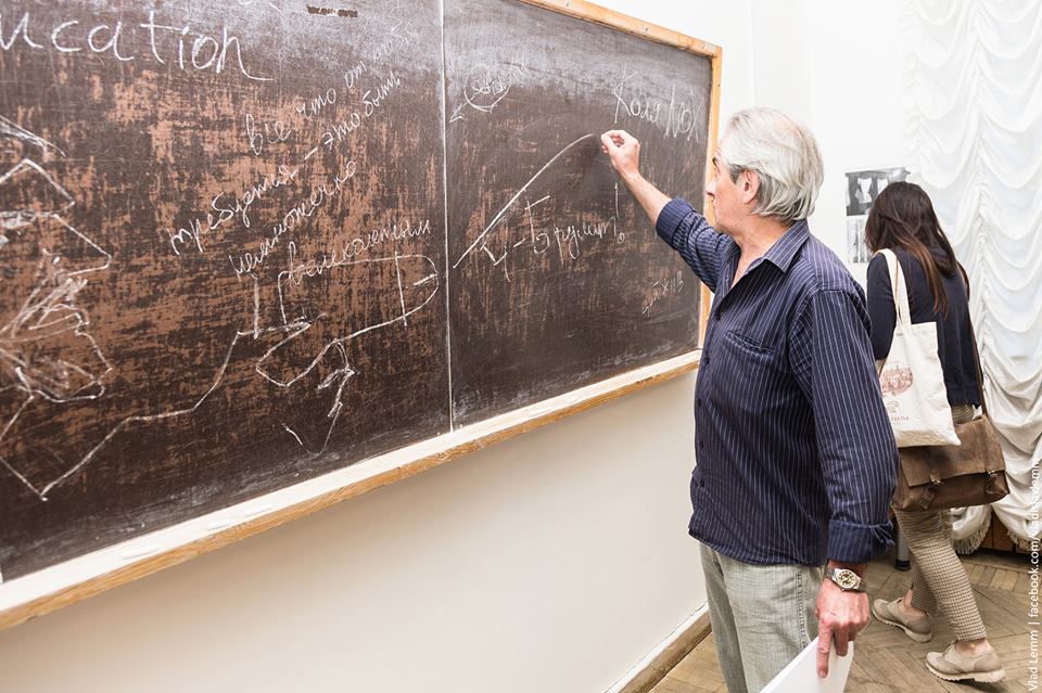 Поскольку локация обставлена как классическая учебная аудитория, визитеры сделали первое, что призывало к интерактиву – стали оставлять на доске послания. Back to school. Автор менее всего ждал подобного фидбека, посчитав его проявлением инфантилизма. Подтекст фрустрации понятен – не с этими людьми разрывать порочные круги. Боюсь, протестный месседж проекта дошел не до всех. А вот был бы artist talk по свежим следам, глядишь, кто-то и возбудился бы в нужном направлении.