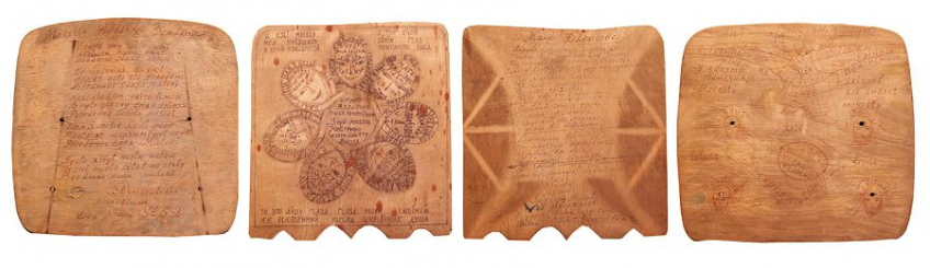 Четверо деревянных скрижалей из сидений и спинок ученических стульев. Выполнил VеLiкiй Иussusь Наzорянин Яsbsasiatresя, сокращенно просто Сеся.